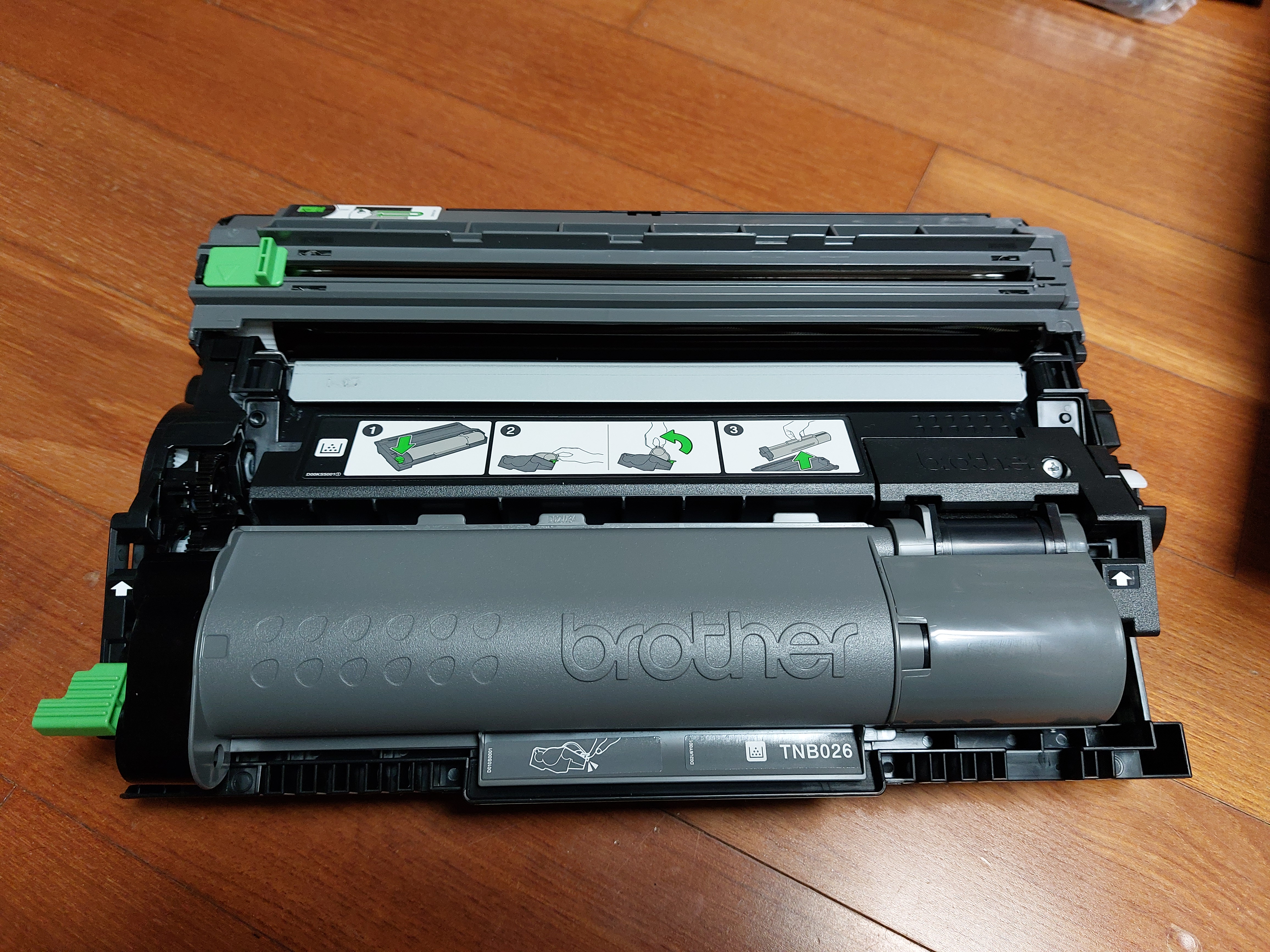 토너와 드럼은 쉽게 아래와 같이 조립된다. 아무리 그림이 잘 나와 있어도 이런 것을 처음 조립하는 사람이면 힘들게 느낄 수도 있겠지만 자신감을 갖고 끼워 맞추면 딱 들어간다.